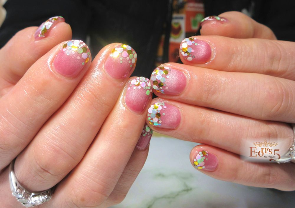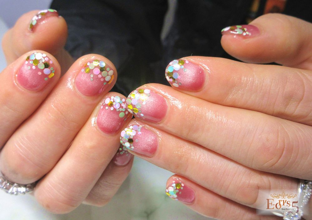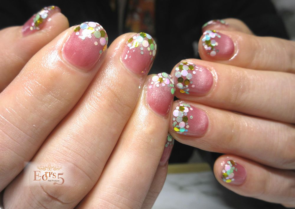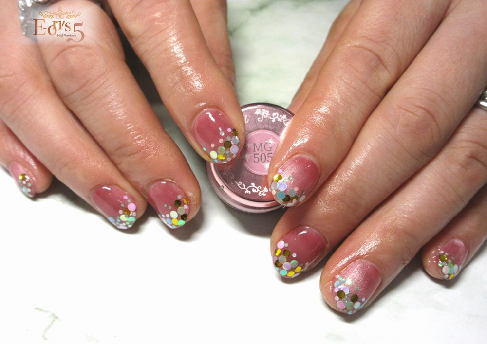カメリアレッドの新色マグネットカラーを中央の煌めきにして、先端を色んなホログラムでグラデーションにしました。