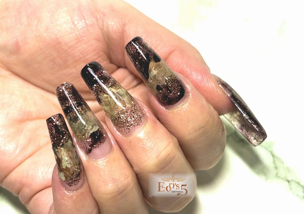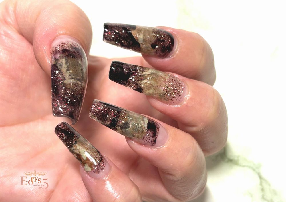 このデザインは、天然石風の柄に、マット黒とレッドラメを掛け合わせた、とてもオシャレなデザインです!