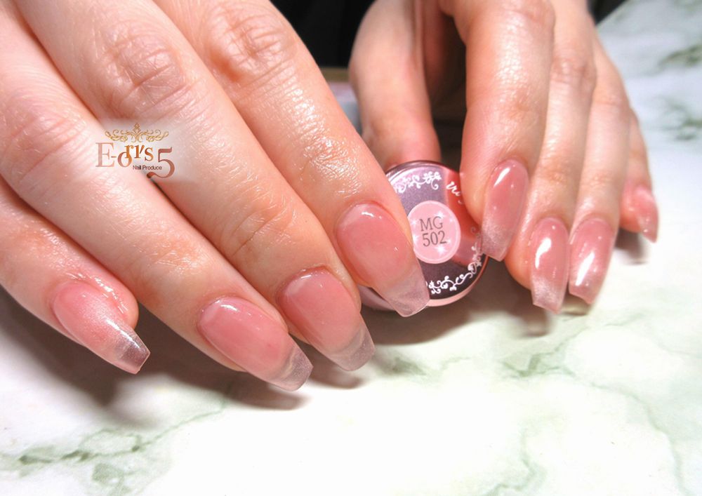土台をアクリルスカで長さ出しし、形をバレリーナで作って、今お出ししている新色マグネットカラーのちゅるんまぐを塗って、先端グラデーションの煌めきにしました。