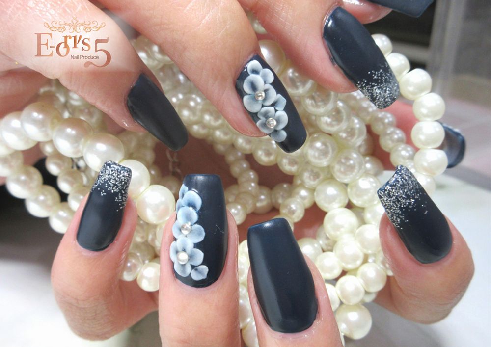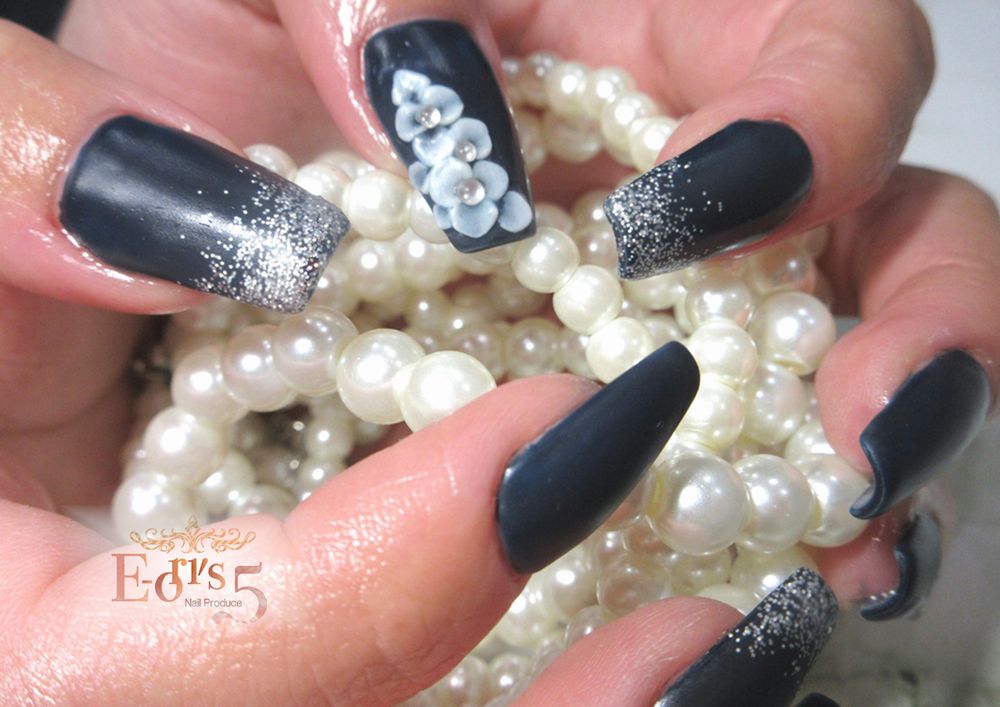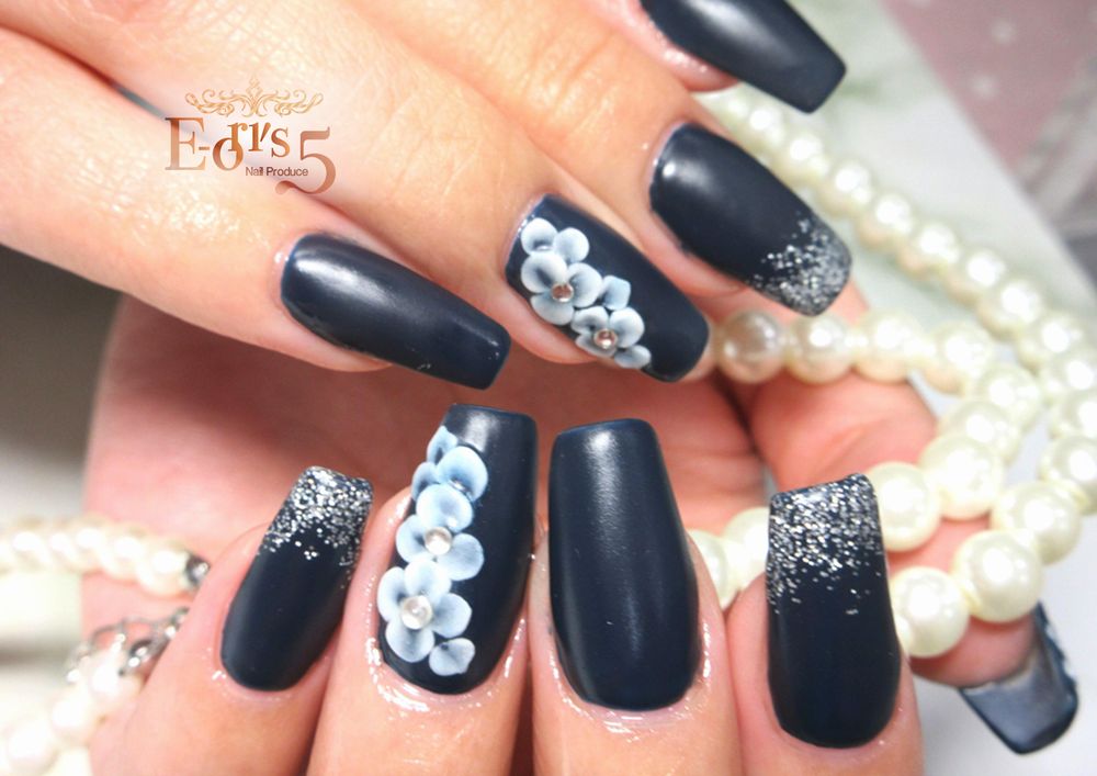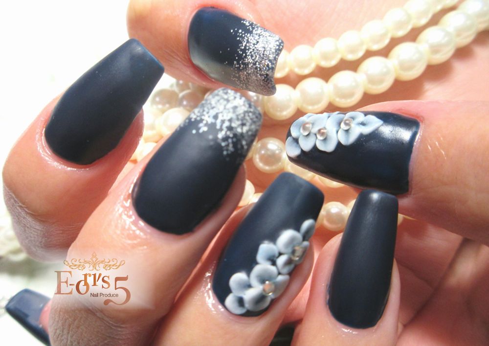 アクリルで長さ出ししてバレリーナスタイルにし、 ネイビーをフルコートとシルバーラメのグラデーションのデザインと、ホワイトフラワーをエンボスでデザインしました。