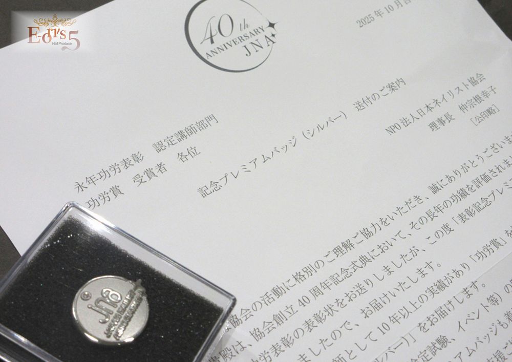 先日、NPO法人日本ネイリスト協会から、シルバーバッジを頂きました。