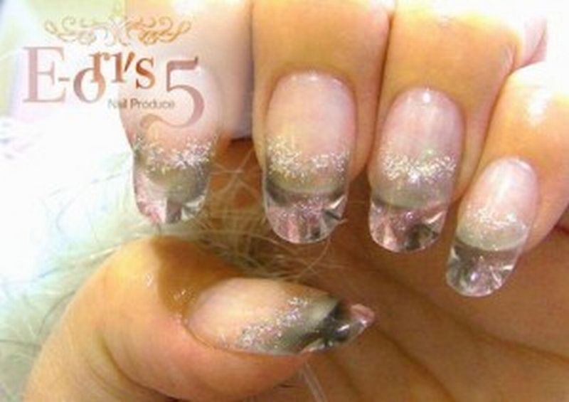 キラキララメを根元側からベッド全てを作り、先端をスカルプチュアならではのクリアにしたデザインです。