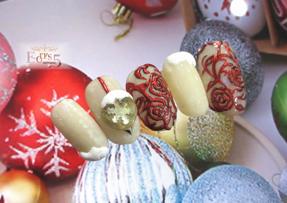 球体で雪の結晶が組み込まれたオーナメントを中心に、エレガントの象徴レッドローズを華やかに飾ったり、雪が積もった雰囲気もポイントしていますので、12月だけではなく冬にオススメできるデザインとして作りました。