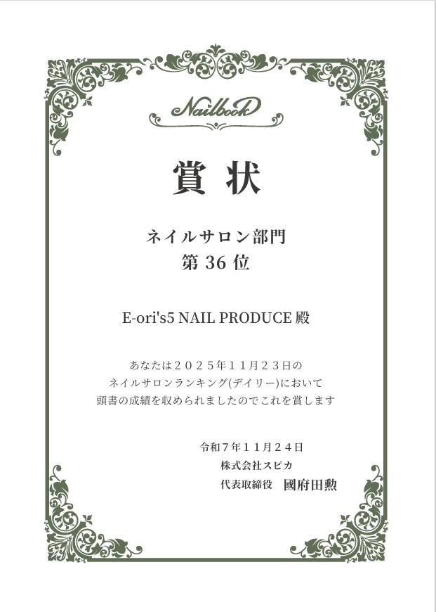 この度、全国のネイルサロンさんの中からランキングトップ50位以内になりましたので、ネイルブック様から賞状を頂きました♥
