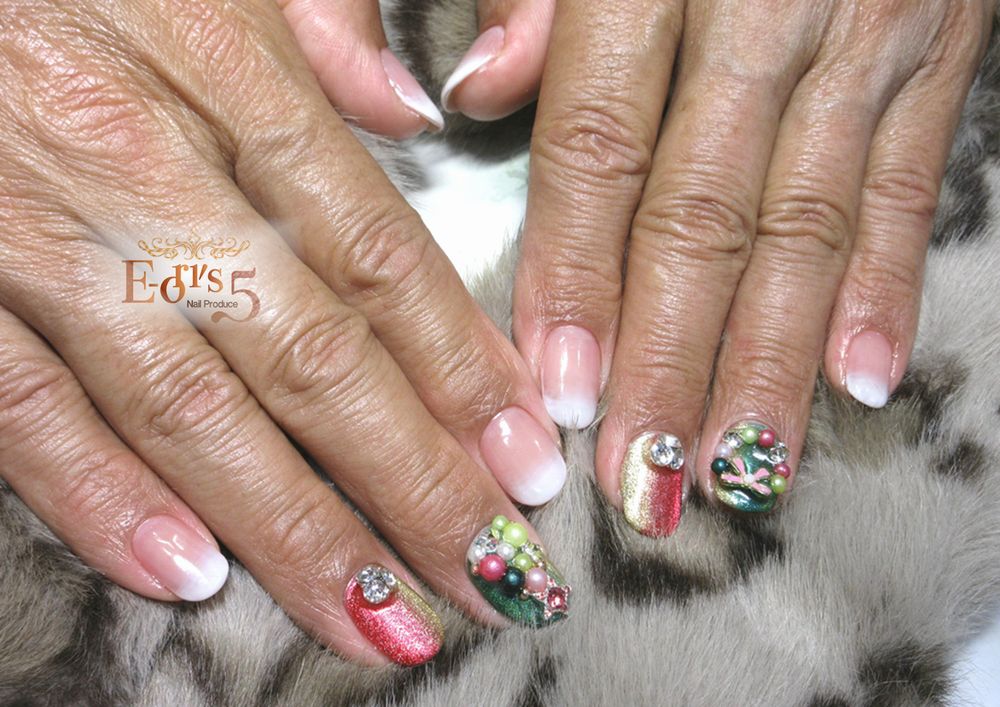 IKKOさんネイルに、クリスマスカラーのCat‘seye・マグネットジェルで、レッドとグリーンの縦グラデーションにし、リースとツリーをストーンで飾りました。