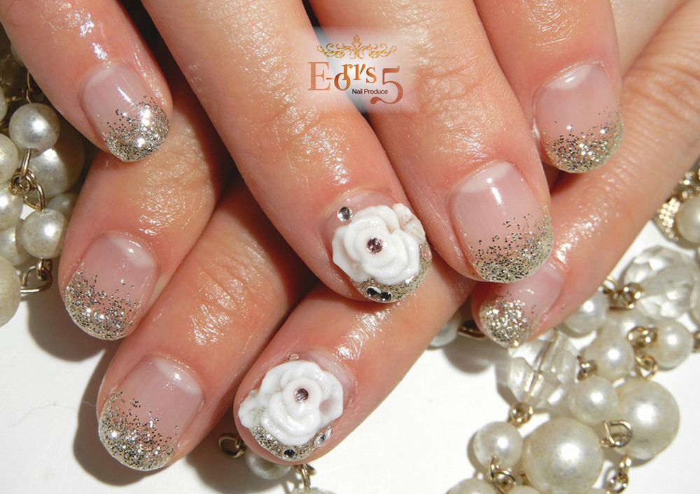 プラチナシルバーのラメをグラデーションに、 ホワイトバラのエンボスをポイントに飾りました。