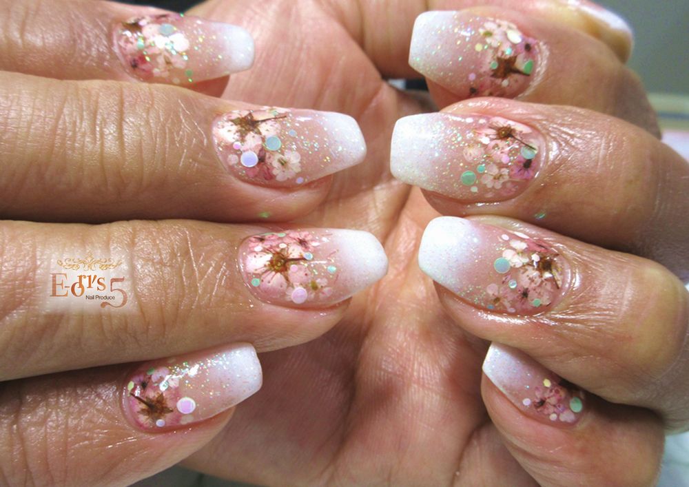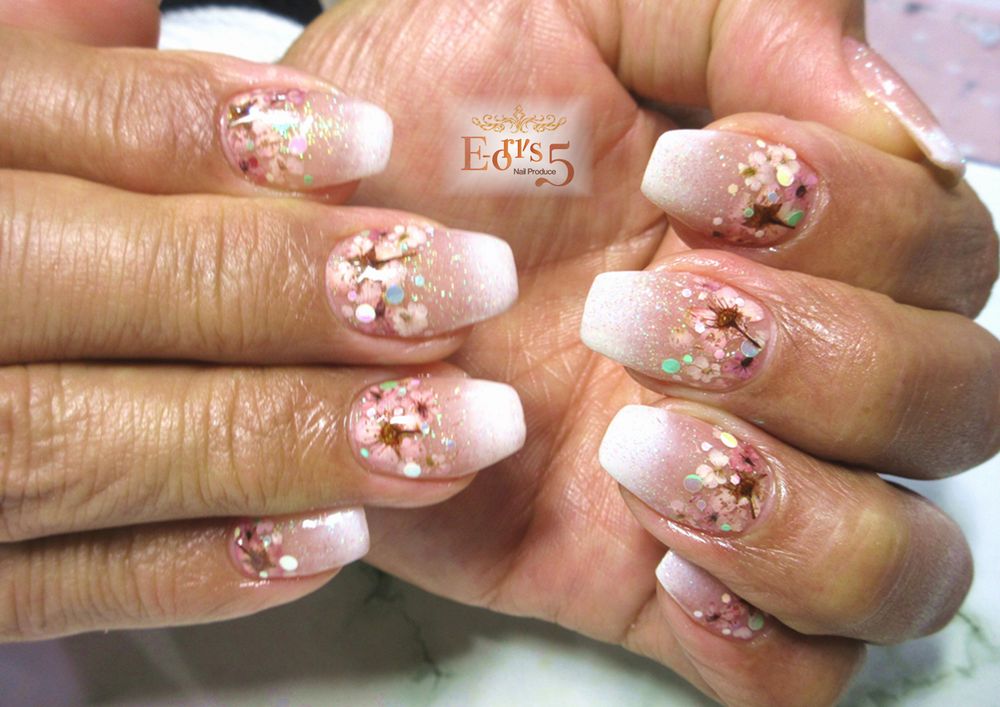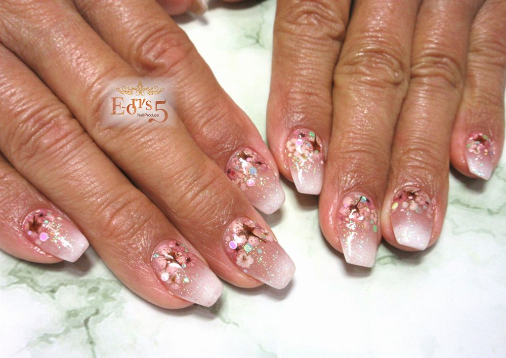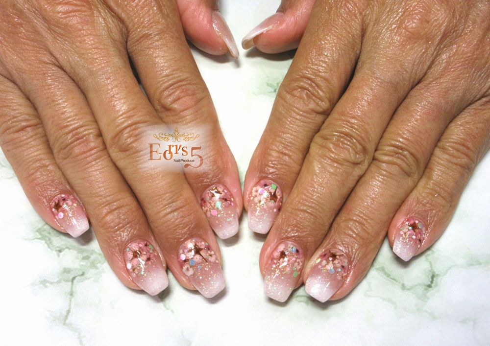 IKKOさんネイルをベースに、押し花やホログラムなどを根元からグラデーションにして飾りました。
