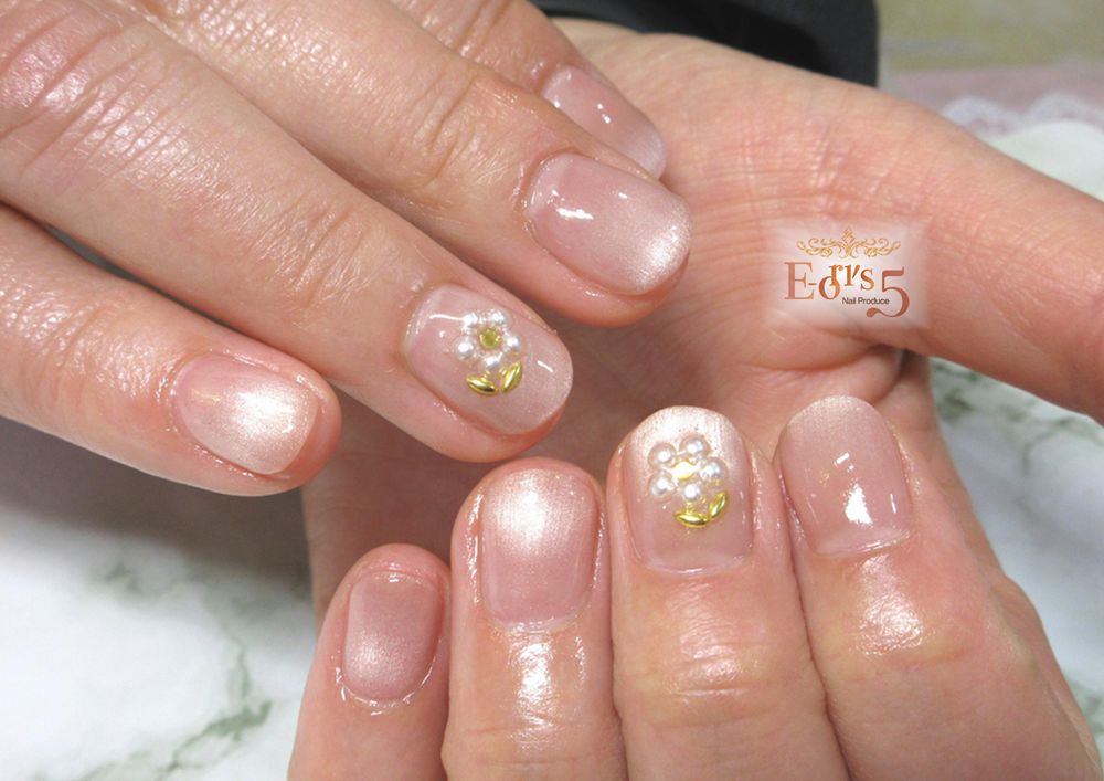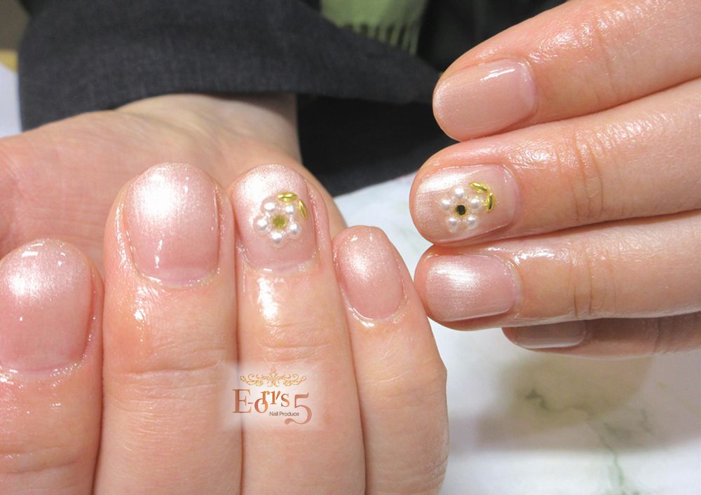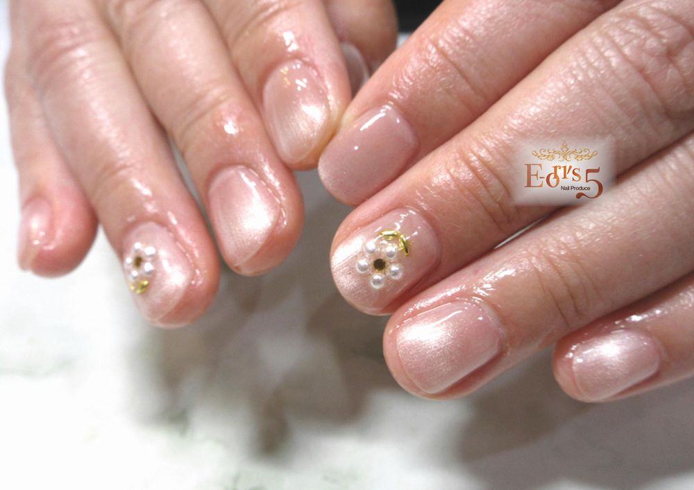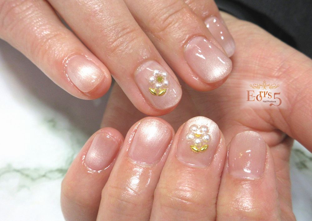 ピンクのマグネットを先端グラデーションの煌めきにし、パールでお花を作ってポイントにしました。