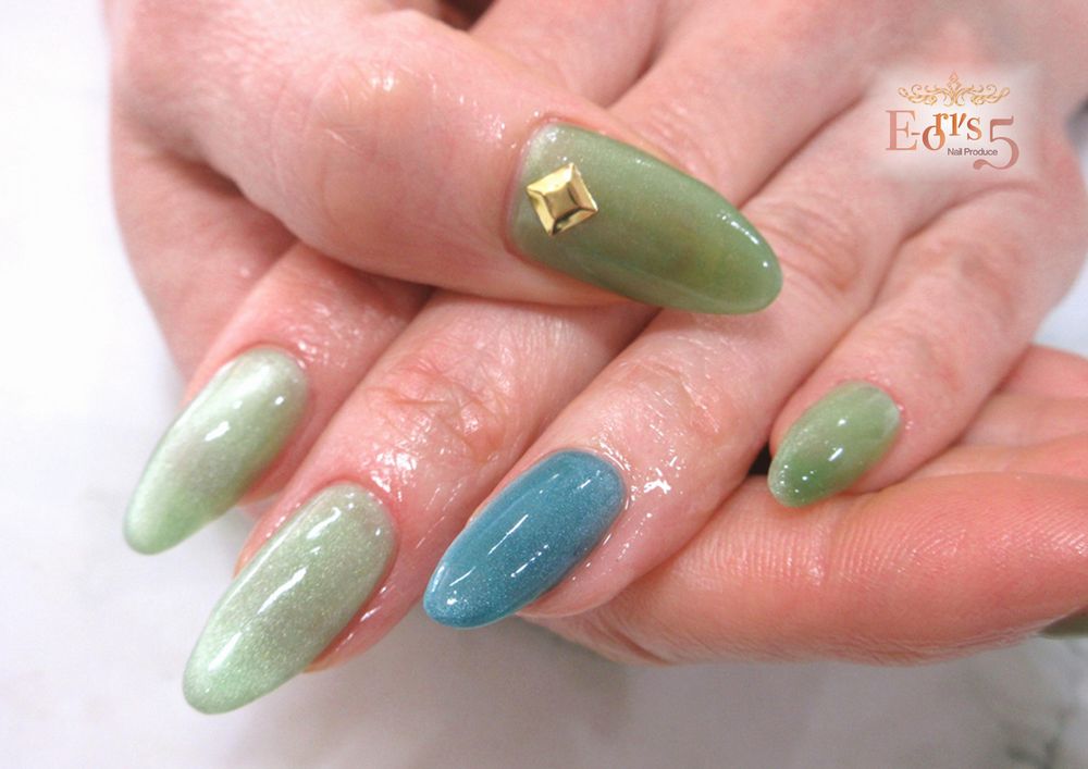 綺麗な地爪のロングネイルに、水光マグを2色使いポイントにゴールドスタッズを飾りました。