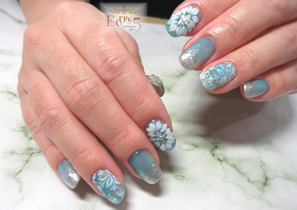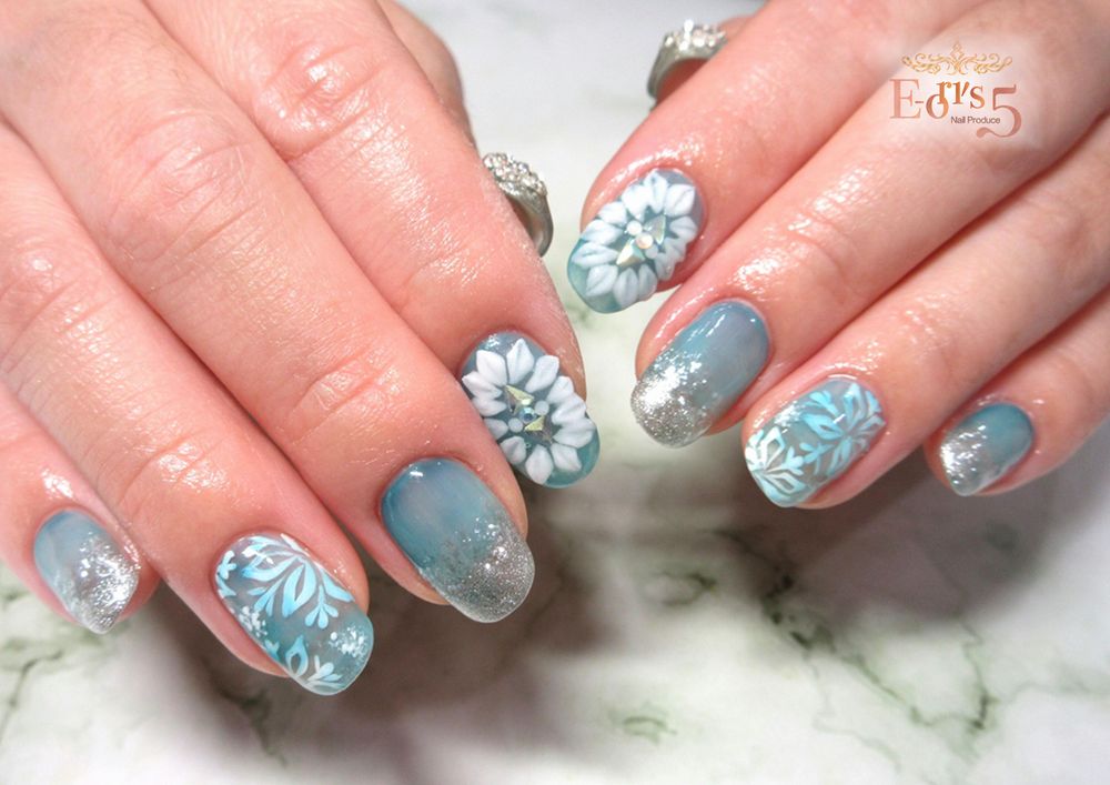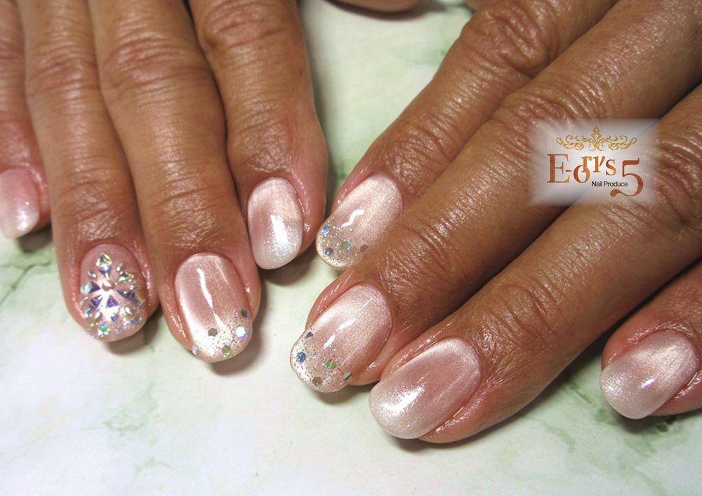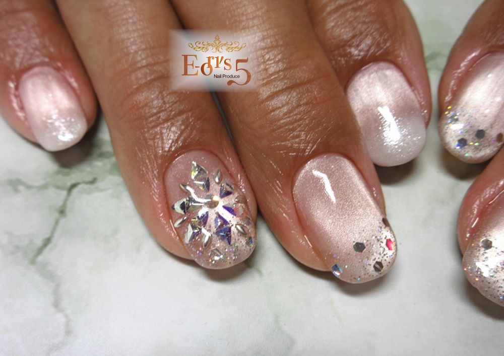 マグネットジェルをベースに使ってパールホワイトのグラデーションに、1本だけ雪の結晶をホログラムで形作ったり、ホログラムを先端に散らて雪をイメージしたデザインです。